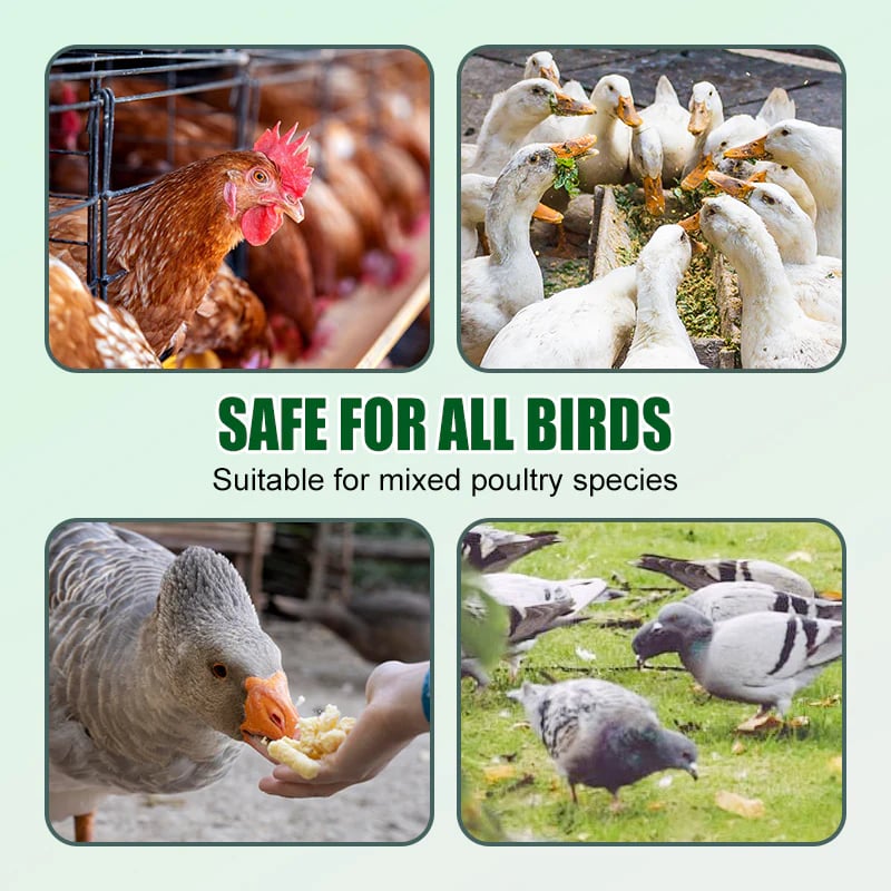 SAFE FOR DIVERSE POULTRY AND MORE - Formulated for chickens, ducks, geese, pigeons, and quail. Gentle and effective for mixed flocks, offering a safe, all-in-one solution for different bird species.